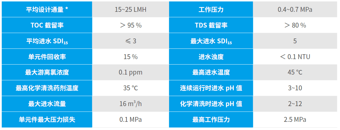 工作壓力低 系統(tǒng)工作壓力0.4~0.7 MPa,較傳統(tǒng)低壓反滲透膜低30 % 以上;